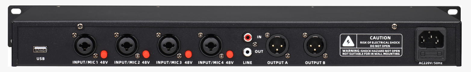 6. 输入输出接口:4通道MIC输入:支持48V幻象电源,独立开关控制。2路MIC平衡XLR输出:提供高质量的音频输出。1路LINE IN输入和1路LINE OUT输出:支持外部设备连接。