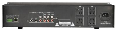 9.支持自然灾害、地震广播、自定义1、自定义2四个广播快捷键,长按快捷键可以快速发起设置好的广播任务; 10.支持三种采播模式:“普通采播”、“中等采播”和“高保真采播”支持定时采播任务、临时采播任务,采播任务优先级别可通过服务器设置; 11.1路短路输出,2路短路输入,支持灵活的自定义功能,可实现短路采集、报警触发,并实现电子门锁、消防、监控等第三方设备及平台的联动应用; 12.3路线路(AUX)和2路话筒输入,1路EMC(紧急)输入,每个通道独立音量调节功能, 具有高音(TREBLE)和低音(BASS)独立调节,MIC 1具有默音深度调节功能; 13.一路EMC输入接口,输入紧急报警语音信号为直通,具有最高优先级,优先级:EMC>MIC1>AUX1; 14.内置4路可控外接电源接口,4路可控外接电源具有手动开关按钮,可以在无网络信号的情况下,手动开启电源输出; 15.支持扩展支持文本广播,可将文字转成语音,广播给任何个区域,语速与语音可以自定义。